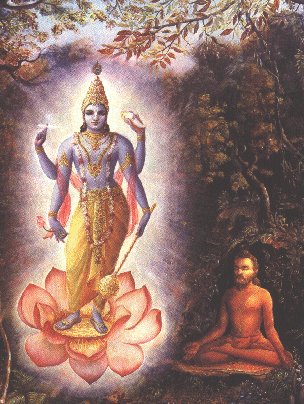 His Divine Grace A. C. Bhaktivedanta Swami Prabhupada, the world's most renowned Vedic scholar and himself one of the great spiritual masters in the disciplic chain descending from Brahma, states, "Before the creation the Lord was there, and therefore the words spoken by the Lord are vibrations of transcendental sound. There is a gulf of difference between the two qualities of sound, namely prakrta and aprakyta. The physicist can deal only with the prakrta sound, or sound vibrated in the material sky, and therefore we must know that the Vedic sounds recorded in symbolic expressions cannot be understood by anyone within the universe unless and until one is inspired by the vibration of supernatural (aprakrta) sound, which descends in the chain of disciplic succession."(9) A material sound is different from the object it represents. For example, the word water is different from the substance water, but Vedic sounds are nondifferent from the spiritual realities they represent. By receiving the Vedic sounds from the proper channel, the spiritual realities embodied in them are directly communicated to the receptive listener. The requirement is that one receive the knowledge as heard and pass it on without change. In this way the information remains perfect. At a certain point in history the Vedic sound vibrations were set into writing by the great sage Vyasadeva. These writings form a standard body of knowledge, and the teachings of spiritual masters can thus be examined to see if they conform to the Vedic texts such as Bhagavad-gita.